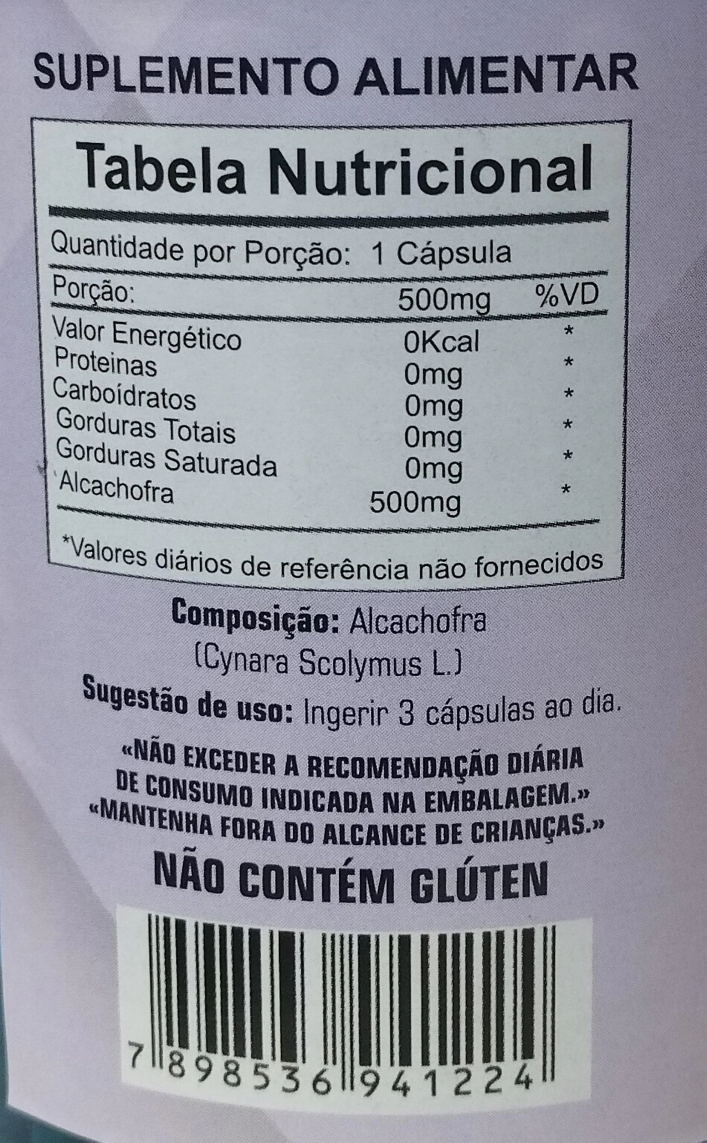 Alcachofra, excipiente q.s.p. cápsula vegetal.