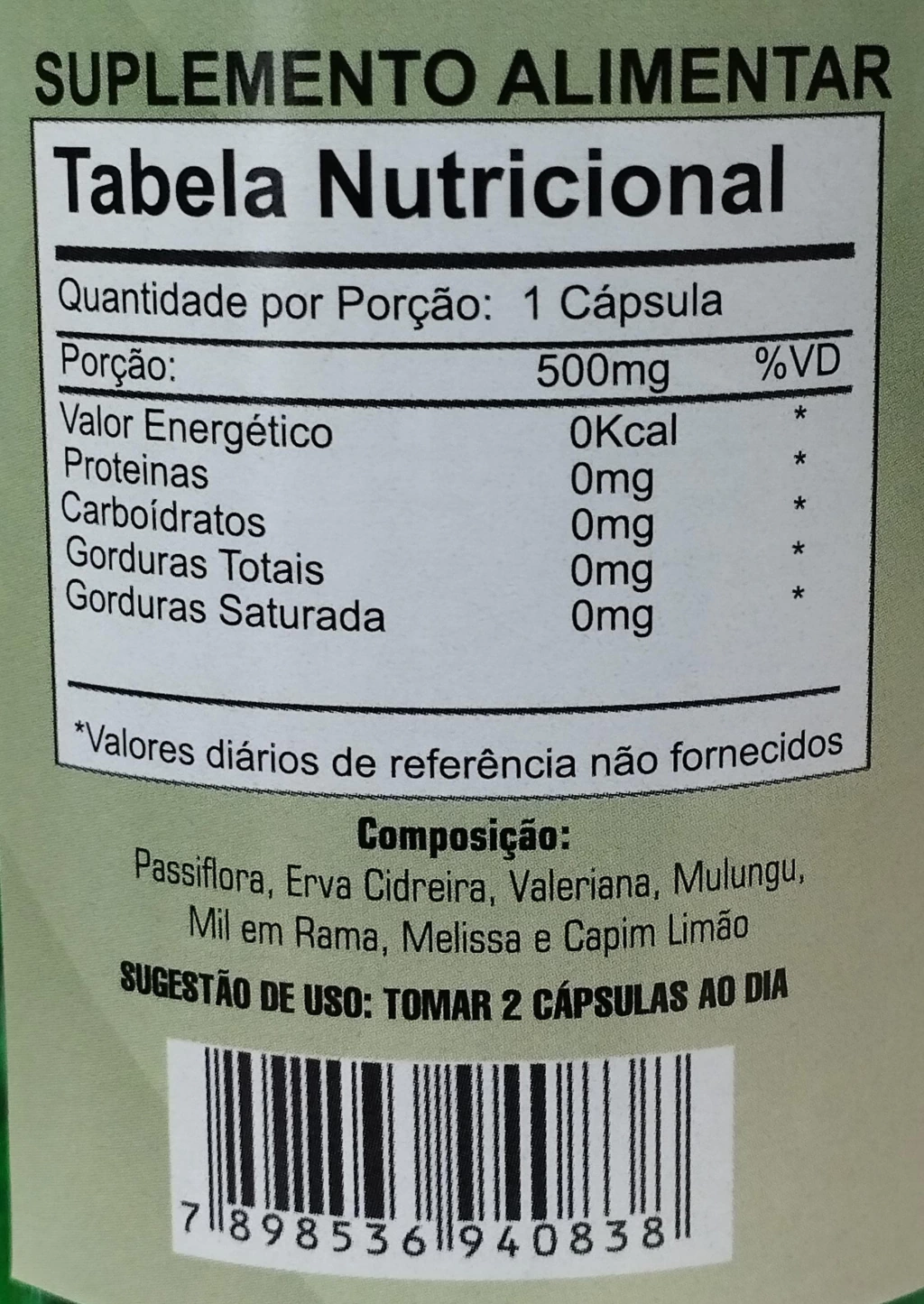 Passiflora, Erva Cidreira, Valeriana, Mulungu, Mil em Rama, Melissa e Capim Limão, excipiente q.s.p. cápsula vegetal.