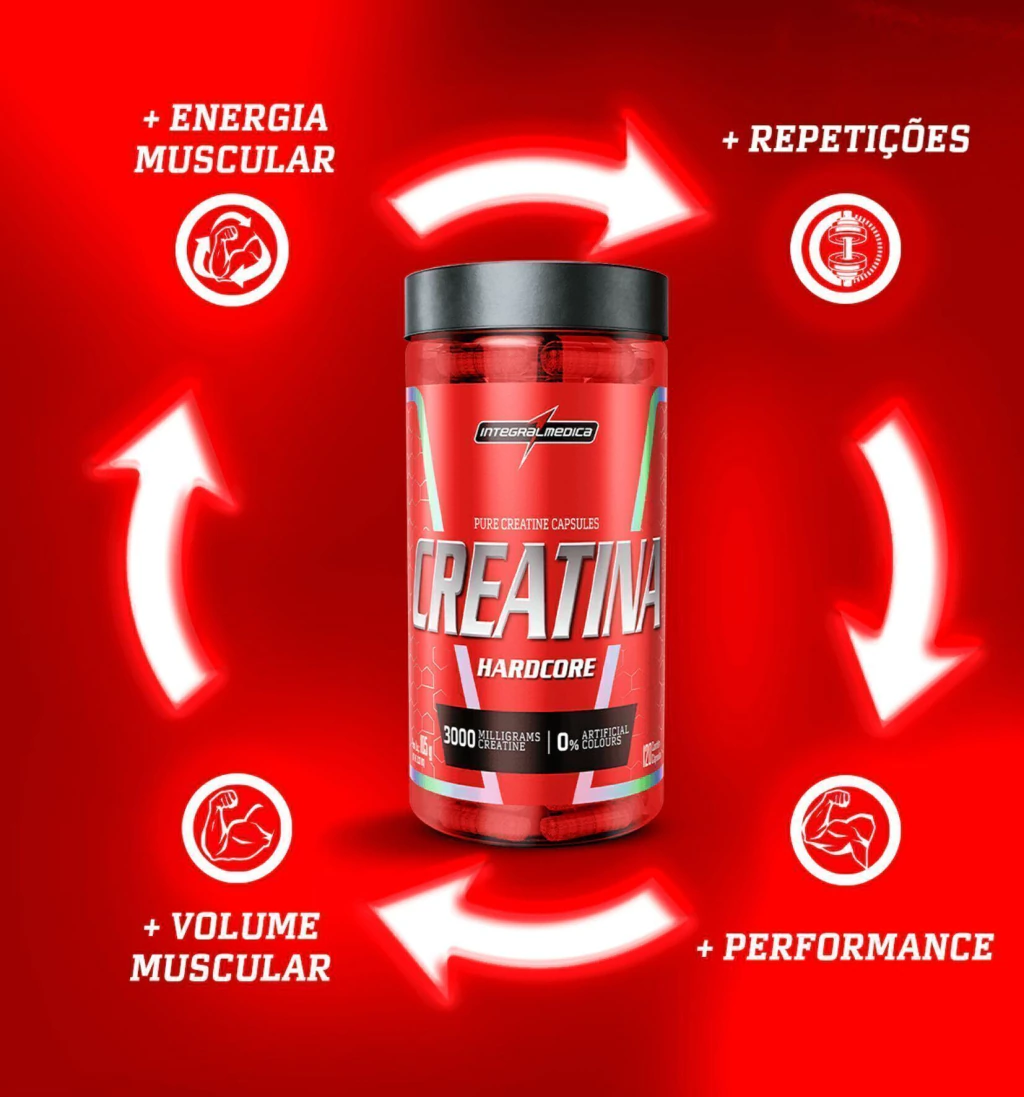 A Creatina Hardcore 120 Cápsulas da Integralmédica oferece uma maneira prática de manter seus níveis de creatina armazenada nos músculos , garantindo mais energia e explosão para os treinos. Embora seja encontrada em alimentos como carnes e peixes, a suplementação com cápsula de creatina facilita a ingestão diária, maximizando os benefícios da creatina sem a necessidade de preparações complexas.